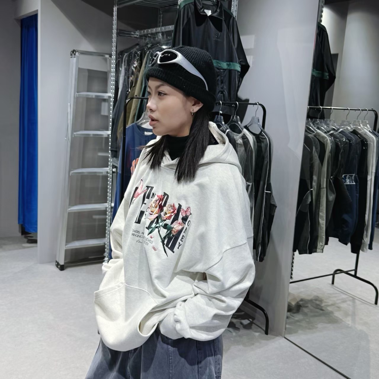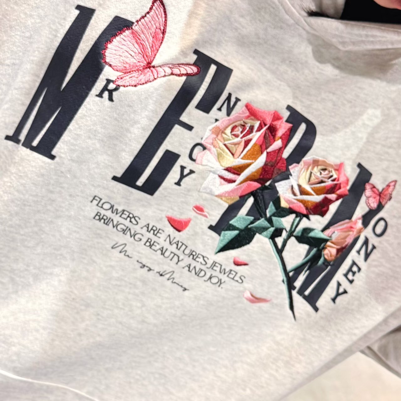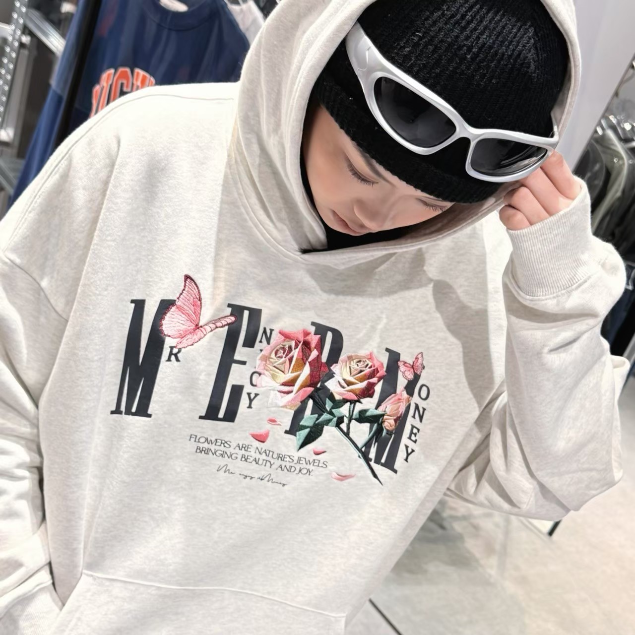 MEDM摺紙玫瑰刺繡帽T/灰白